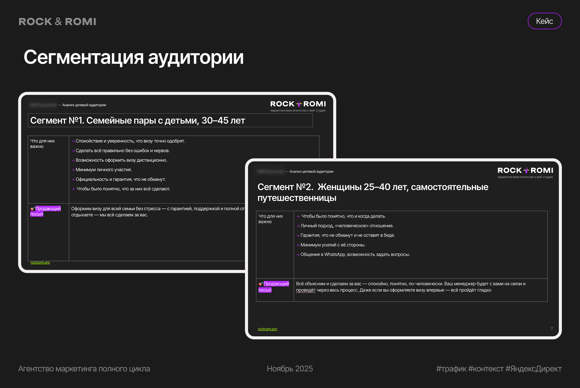 Доверие решает всё. Люди боятся отказов и бюрократии; креативы с гарантией, договором и цифрами из кейс‑стади (12 000 виз, 99% одобрения) вселяют уверенность.