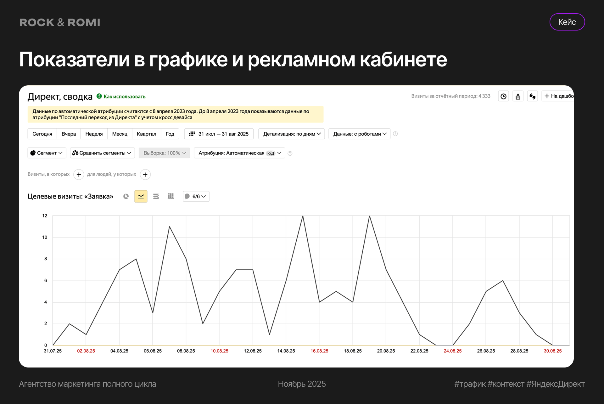 1 этап. Запустили кампании в Яндекс. Директ (поиск + РСЯ), создали первые креативы и квиз‑лендинг. Начали собирать статистику.
