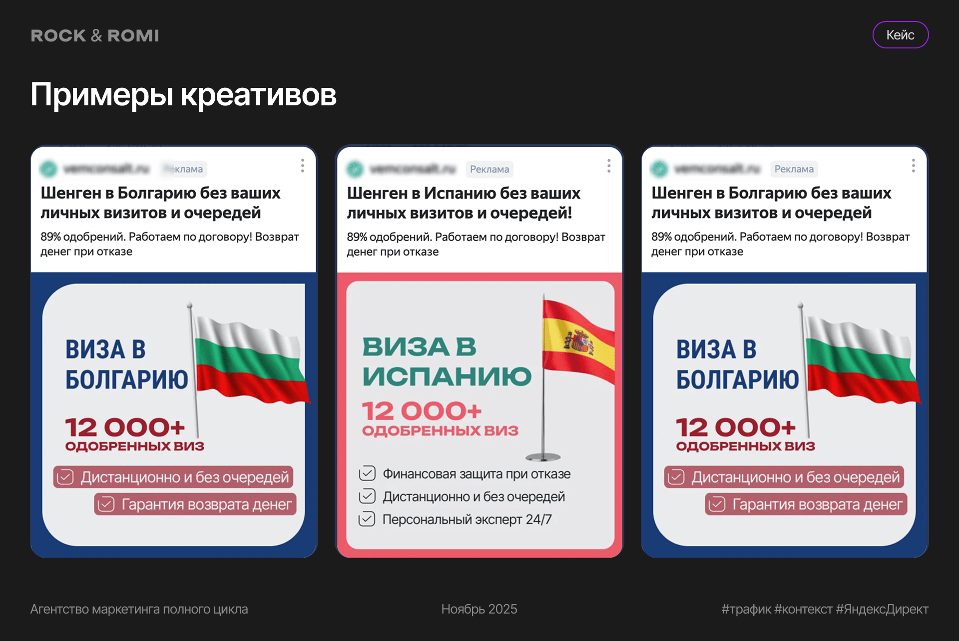 Гарантии и надежность. Креативы вроде «Шенген без отказа — получи визу или деньги назад» давали высокий отклик: люди меньше боялись отказа.