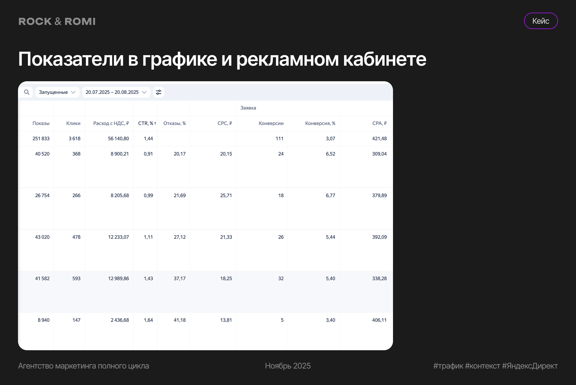 4 этап. Постоянно мониторили CTR, CPC и CPL: корректировали ставки, использовали минус‑слова, перераспределяли бюджеты на лучшие связки «ключевик + оффер».
